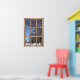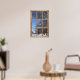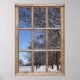 Den här vackra snöscenen visar en park på vintern. Snö linjer grenar i träd och ljuger djupt på marken. Himlar är blått och parken har förvandlats till ett vinterland. Vyn är uppbyggd av ett träfönster ram som skapar effekten av ett falskt fönster som du kan titta igenom till den snö-täckta parken utanför.