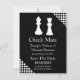 Svart-vit bröllopsannonsering med schacktema. Siluetterna av en vit schackkung och schackdrottning pryder toppen av den svarta annonsen, med övre och nedre hörnen i ett svart och vitt rutmönster. Vit text är redo att anpassas med din bröllopsinformation. En underbar annons för schackälskande par.