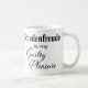Vitt kaffe mugg med svart text har ord: "Schadenfreude är mitt borgerliga nöje". Definitionen av den tyska orden "Schadenfreude" ligger på motsatt sida om mugg.