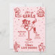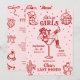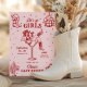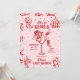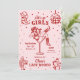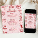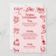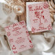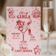 Den här rosa och röda inbjudan och programmet för möhippan har ett djärvt retro-västerländskt ”sista rodeo” tema med lekfulla illustrationer i doodle-stil, perfekt för firande i sann cowgirlanda var som helst. Framsidan visar en självsäker cowgirl som vilar i ett martiniglås, omgiven av fantasifulla doodles av cowboystövlar, hattar, diskobollar, kaktusar och stjärnor, som blandar rustik västerländsk charm med livliga fester. Baksidan visar en komplett helgplan som ramas in av matchande doodle-ikoner som lasson, stövlar, drinkar och hästskor för ett roligt och sammanhållet utseende. Med sin livfulla färgpalett, fräcka handritade detaljer och matchande design på fram- och baksidan