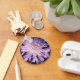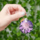 Eine grosse lila Scabiosablüte vor dunklem Hintergrund ist auf diesem Schlüsselanhänger.