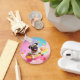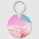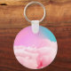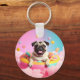 Dieser niedliche Schlüsselanhänger zeigt einen glücklichen Mops im Donut-Schwimmreifen – schwebend auf Zuckerwattewolken, umgeben von bunten Lollis auf himmlisch pastelligem Hintergrund.