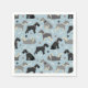 Cute Schnauzer hundar i svartvitt, salt och peppar och svart och silver jackar sitt, stå och välta med utspridda hund ben och tass avtryck på ljusblå bakgrund.