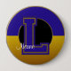 Skola Färg Monogrammed Button, Blue och Guld, Brev L- En stor, 4-tums knappnålknapp med en häftad monogrammofonknapp brev i mitten. Bakgrunden till denna knapp skapas i två skolor färg (blå och guld) där en skärning av hål i mitten visar en svart bakgrund under. Rundan ram är uttrimmad i mitten och yttre kant med en trevlig guld-fälg. I mitten finns ett stort alfabet brev som putsats i guld. Det finns redan ett textområde i ställe där du kan anpassa dig som du vill. Du kan skriva ett första namn, efternamn, namn eller något annat du vill. Du kan också välja att radera textområdet om du vill. Anpassa knappen färg till kostym. Den här kollegiala monogramknappen finns i färg i olika skolor.
