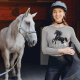Dynamischer schwarzer Pferdprint mit fließender Mähne und Schnee-Spritzern; markantes Motiv für Reiterinnen, Naturliebhaber und Abenteuerlustige.