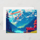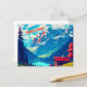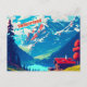Schweiz Retro Alpisk Stuga Resa Postkort har en alpstuga inbäddad i de schweiziska alperna med utsikt över en sjö med röd typografi . 2024 Victorious2 www.zazzle.com/store/Victorious2