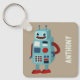 Den här nyckelkedjan är redot att vara personlig med en namn eller annan text på framsidan och har illustrationer av tre söta robotar i blå och röd vintage med en robot på framsidan och två till på baksidan.