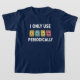 Humoristisk, vetenskapsrelaterad svart t-shirt. Övre text: "I ENDAST ANVÄNDA" i fetstil vitt. Central: Fyra periodiska block av bord - S (Svavel), Ar (Argon), Ca (kalcium), Sm (Samarium) - stavning av "Sarcasm" fonetiskt. Grund: "PERIODICALLY" i fetstil vitt. Spelande, nervös design för vetenskapsentusiaster.