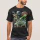 Vintage-futuristic, science fiction illustration of a beautiful female astronaut holding a vintage-style ray gun while shooting out green lasers at the Mother Ship.