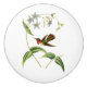 En grönt- och brunthummingbird med en röd hals flyger nära en tropisk växt för tweedia (Apocynaceae) med ljust - blåa blommor.