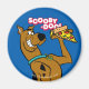 Ta en titt på Scooby-Doo sitta med ett stort leende och håll upp en bit av full crust pizza.