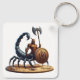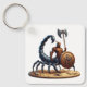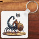 Scorpion Man som håller en Ax och bär ett runt träsköld, står på öknen som mark i stil på Glorantha RuneQuest. Av martinspixer.
