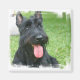 Svart skottie hund med tunga som hänger ut magnet.