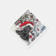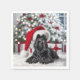 En svart skotsk hund bär en julhatt medan han ljuger på en flytande vit päls matta.