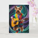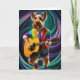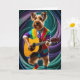 En skotsk terrier i en färglös kostym spelar en akustisk gitarr.
