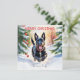 Ett attraktivt julkort med bild av en svart skotsk Terrier-hund som går längs en snövit väg, i en vattenfärg stil. Vinterlandskapet omfattar vintergrönt träd, röda bär och söt vinter himmel. Perfekt för hundälskare, snyggtens helgdag kan vara personlig med ditt namn eller annan text.