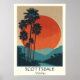 Fånga den sofistikerade och snyggt som präglar Scottsdale, Arizona, med denna minimalistiska återreseaffisch. Eleganten har silhuetterna handflatan träd mot ett djärvt och varmt sol, vilket återspeglar stadens unika blandning av lyxlyx i öknen och modern coola i mitten av århundradet. Den här chicen är en perfekt som är utmärkande för ett modernt hem, kontor eller gallerivägg.