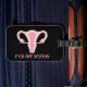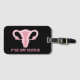 Ett bagagemärke med ett meddelande till Högsta domstolen i Stater och vältning av Roe mot Wade. Rosa uterus-grafik med "f*ck av SCOTUS"-text