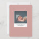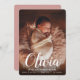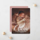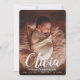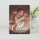 Låt baby namn gå i centrum med elegant tillkännagivande för födelse, med ett lodrät foto med baby först namn överlagt med vit kalligrafi-skript. Anpassa till baby mitten och efternamn och födelsestatus under. Lägg till ett foto på baksidan tillsammans med ett personligt meddelande.