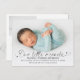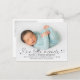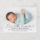 Födelseanmälningskort med stort foto framtill, script "vårt lilla mirakel", modern typsnitt. På baksidan finns ett annat foto med anpassningsbar text.