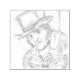 En blå och vit pennskiss av Ebenezer Scrooge i hatten och jacka.