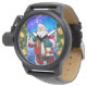 Fotomontage och grafism av en staty i Jultomten med en väska i leksak och en klocka nedåt i vinterblå berggrund. Det finns en mousserande grönt över träd med guld jul bollar.