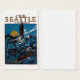 A vintage affisch som befordrar resor till Seattle, Washington under 1915. En handfull bild av Seattle hamn och arkitektur som man ser på natten med ett fullt måne stigning i bakgrunden.