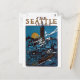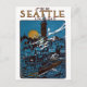 A vintage affisch som befordrar resor till Seattle, Washington under 1915. En handfull bild av Seattle hamn och arkitektur som man ser på natten med ett fullt måne stigning i bakgrunden.