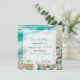 Vackra kustkort bröllop spara datum med vinkart havsområde, blått tårglas och grönt havsglas på sanden.