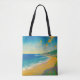 Sand, blå hav, blå himmel och söt färgstarka blommor. En avslappnande kustscen.