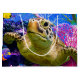 Vackra havssköldpaddor simmar bland tropiska fiskar nära en färglös rev.