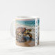 A coastal themed personalized coffee mug with an illustration of a mama sea turtle and baby crawling into the blue ocean waves on a sandy beach. Just add a name or family member such as "grandma" in the personalize area.