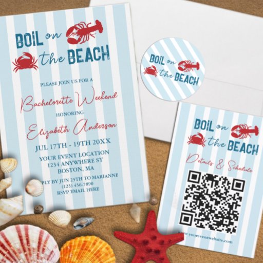 Boil on the beach! Seafood boil bachelorette weekend with a crab and lobster against a coastal blue striped background