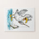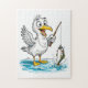 Illustration of a seagull standing in shallow coastal water while holding a fishing rod with a caught fish. Maritime setting with expressive character elements.