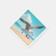 A seagull flies gracefully over a sandy beach, clutching a red and white polka dot bikini top in its beak