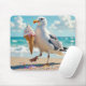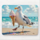 A seagull stands on a sandy beach holding a melting ice cream cone topped with colorful sprinkles