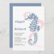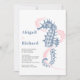 Seahäst och sjögräs dammig, blå och bröllopsinbjudning för rosa med dammig och rosa sjögräs medan namn är skrivet i en modern djärv typografi. Den här moderna visemiska malldesignen är perfekt för ett sommarbadbröllop. Baksidan är av fast dammblått färg.
