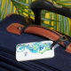 Den här anpassningsbarna bagagetaggen visas i vitt med en blå sjötrycksdesign. Anpassa den här märkrn och ändra exemplet namn till ditt med den här mallen.
