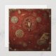 An ornate emblem glows in gold against a textured crimson backdrop, surrounded by arcane symbols and cryptic inscriptions.