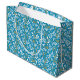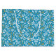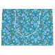Seamless floral pattern with white and gold stylized plants on a blue background. The design is symmetrical with a refreshing, elegant feel.