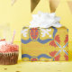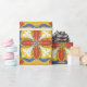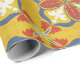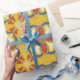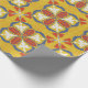 Seamless floral pattern with red, white, and blue petal motifs on a yellow background. Decorative and symmetrical, conveying a vibrant, lively feel.
