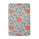Seamless floral pattern with vibrant orange flowers and navy blue leaves on a beige background, creating an ornate, symmetrical design.