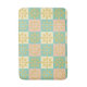 A seamless pattern with geometric floral motifs in yellow, pink, and teal on pastel squares, creating a vintage, harmonious, and cheerful design.