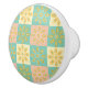 A seamless pattern with geometric floral motifs in yellow, pink, and teal on pastel squares, creating a vintage, harmonious, and cheerful design.