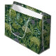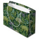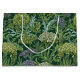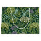 Seamless William Morris style wallpaper pattern featuring dense green foliage and large, rounded flowers in shades of lime green, off-white, and muted lavender against a dark emerald background.