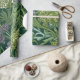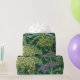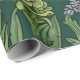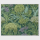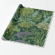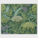 Seamless William Morris style wallpaper pattern featuring dense green foliage and large, rounded flowers in shades of lime green, off-white, and muted lavender against a dark emerald background.