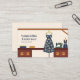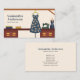 A business card with illustration of a sewing workshop including a blue dress with floral patterns, a sewing machine, a mannequin and a wooden worktop all in a warm hue. Perfect for activities such as seamstress, tailor, dressmaker, alterations, repairs, fashion designer, handmade sewing, etc.