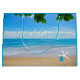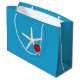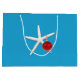 julklappar med strandtema. Stor storlek påse med tropisk havsscen på framsidan. "Seas och Hälsning" är stickprovet hälsning och är lätt att ändra. En vit stjärna, eller havsstjärna, dekorerar hörnet med en annan på baksidan. Påsen är blå.