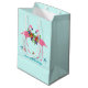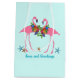 Flamingos pappra julklapp. Mellan storlekt, ljusblått färg med två flamingor och stjärnfisk på båda sidor. Tropisk ordalydelse "Seas & Hälsning" i rosa under flamingon som bär festliga träden av holly- och hibiscus-blommor.