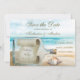 Nautisk, sommarstrand Spara datumkortet innehåller ett antikt budskap om rulla i ett vävlat glas flaska och ett årstidsskal på en tropisk strand med havet i bakgrunden. Bride och Groom namn i handskriftsskriften guld stil och bröllop och andra uppgifter även i guld. Anpassa med namn, bröllop och till och med budskapet i flaska. Baksidan är marin blå. Designad att samordna med mitt Seashells-meddelande i en sviten Flaska bröllop.
